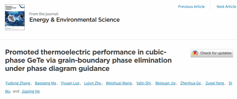 近日,公司铁电功能材料与器件创新团队杨祖培教授、吴笛教授基于相图预测,通过在(GeTe)x(Ag1-δSb1+δTe2+δ)100-x体系中精细调控合金比x和Ag/Sb比值δ, 在保持其立方相结构的同时成功地消除了Ag8GeTe6晶界相,实现了热电性能的显著提升。最终在673 K时获得了~2.0的热电优值,以及~1.5的平均热电优值(323-773 K)。制备的热电器件在480 K温差下实现了6.3%的发电效率和1.32 W的输出功率,属于该体系领先水平。相关研究工作以Promoted thermoelectric performance in cubic-phase GeTe via grain-boundary phase elimination under phase diagram guidance为题,发表在国际材料顶级期刊《Energy & Environmental Science》上,该研究工作为立方相GeTe基热电器件在中温热电发电机中的实际应用提供了强大的推动力。