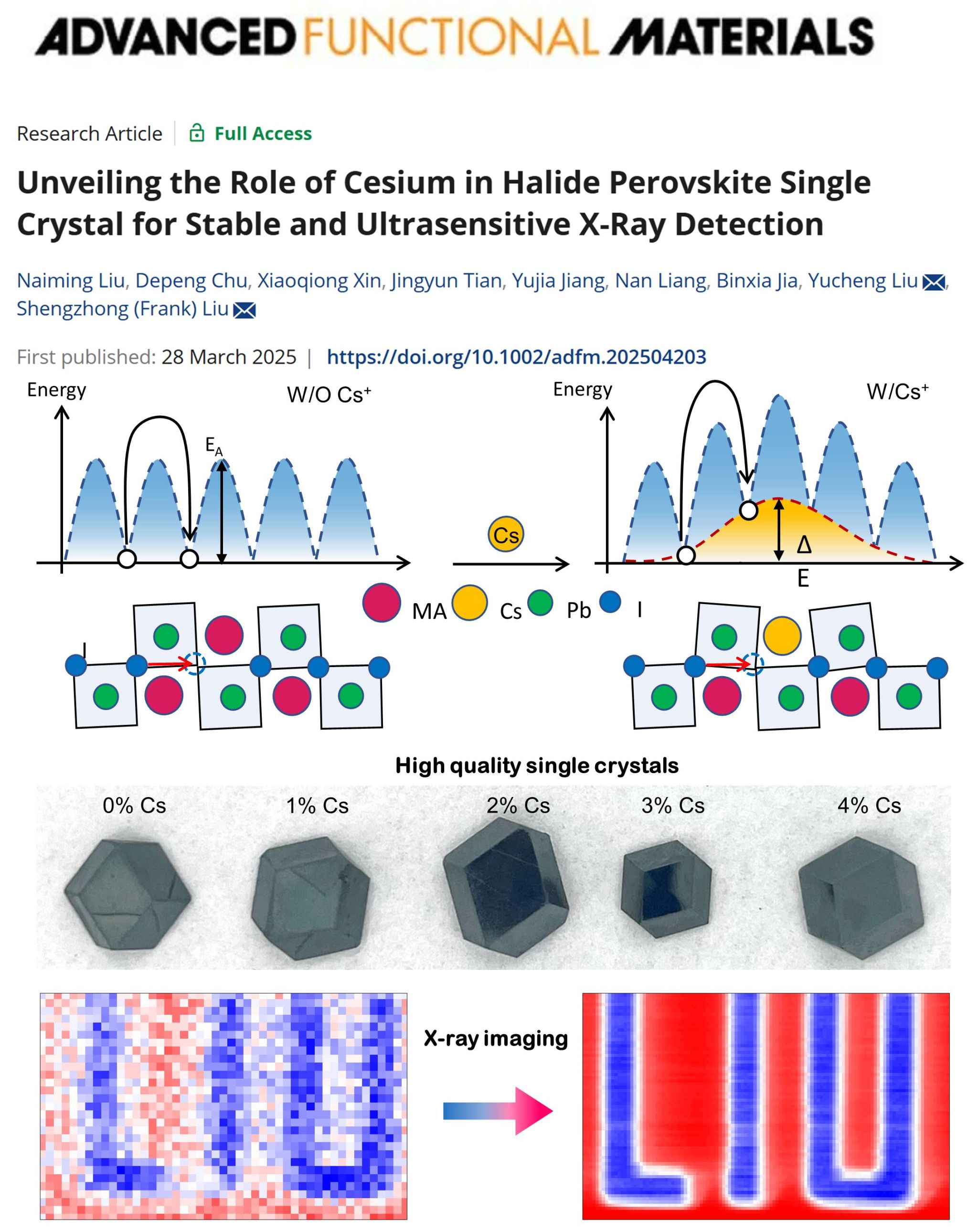 公司钙钛矿材料与器件团队结合理论模拟计算,提出将无机Cs+离子引入MAPbI3单晶,并揭示了Cs+对钙钛矿单晶的晶体结构、缺陷态、能带结构、离子迁移和载流子输运的影响。研究结果表明,Cs+离子的引入降低了单晶的缺陷态密度,抑制了离子迁移,提高了载流子迁移率,并提高了电阻率。因此,使用优化后的MAPbI3单晶制备的探测器获得了49847 µC Gy−1 cm−2的高X射线探测灵敏度,3.1 nGy s−1的低探测限,150 µs的短响应时间,以及在连续X射线辐照和偏压下展示出了优异的稳定性。这些罕见的探测指标组合使探测器实现了高清X射线成像。这项研究工作为设计高稳定高灵敏的X射线探测器提供了一种新策略。该工作近日发表于国际知名期刊《Advanced Functional Materials》上。