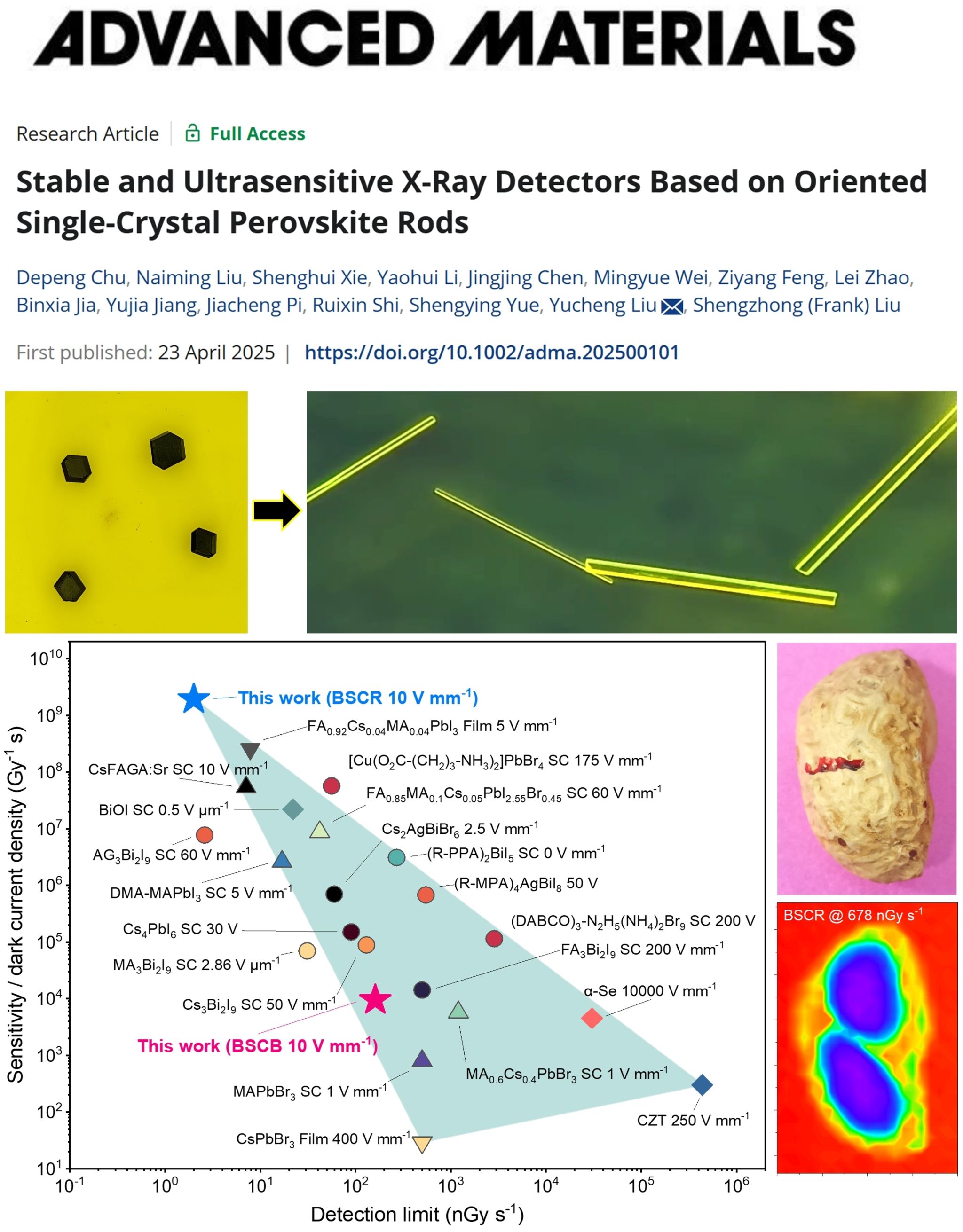 公司钙钛矿材料与器件团队通过设计生物质衍生绿色溶剂γ-戊内酯(GVL)成功生长了高质量和结晶取向可控的钙钛矿FAPbI3单晶,并详细研究了单晶定向生长和晶体结构演变的内在机制。得益于特定结晶取向的钙钛矿FAPbI3单晶棒高的载流子迁移率和大的体电阻率,基于该单晶组装的探测器实现了高的X射线探测灵敏度(2.16×105 µC Gy−1 cm−2)、高的灵敏度/暗电流密度比(1.93×109 Gy−1 s)和超低的X射线响应电流漂移。以上这些优异的探测性能使探测器即使在低至12 nGy s-1的X射线剂量率也能够实现高分辨率的X射线成像。这项研究不仅为开发低剂量X射线成像提供了一种新的技术方案,还为低成本、环保地生产X射线探测的核心材料建立了新的策略。该工作近日发表于国际材料学知名期刊《Advanced Materials》上。