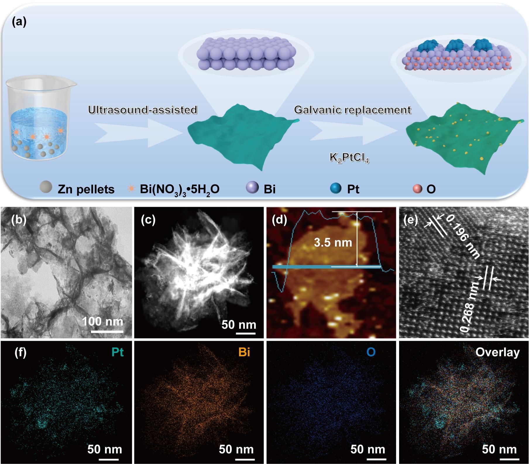 高效利用生物质,通过精准增值的催化转化手段制备高附加值化学品,是当前科学研究热点方向之一。近年来,生物柴油产业的快速发展导致副产物甘油严重过剩,亟待开发高效甘油升级利用技术。甘油催化氧化可生成甘油酸、草酸、亚酒石酸、甲酸等多种高价值产品,然而,传统化学转化方法往往需要严苛的反应条件,例如高温、高压、强酸、强碱等,不符合绿色化学理念。电化学催化因其反应条件温和、环境友好、产物选择性可精准调控等优势,在生物质增值领域备受关注。在此背景下,先进能源转化材料与器件研究团队设计并合成了负载铂纳米晶的氧化铋纳米片(Pt-Bi2O3),通过对催化剂表面组分的精准调控,实现了对甘油分子在催化剂表面的吸附形态控制,凭借吸附形态调控机制,Pt-Bi2O3能够高效地将甘油“精准剪裁”并转化为甘油酸,实现了88.3%的甘油酸选择性和96.6%的总C3产物选择性,成功开辟了一条高选择性合成甘油酸的新方法。