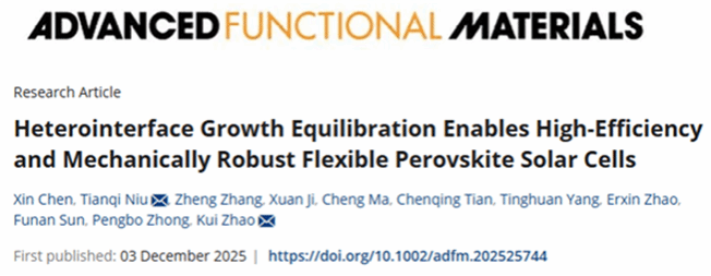 针对在低温工艺和柔性基底条件下,实现高质量钙钛矿薄膜的“本征增韧”与高效电荷输运的核心问题,公司赵奎教授团队提出了配体辅助的异质界面生长平衡策略,通过引入极性可调的双铵芳香配体对低温柔性制备的钙钛矿结晶动力学进行精准调控。该策略能够有效加速溶剂挥发,并在固–液界面与气–液界面实现协同调控,显著缩短成核时间、延长晶粒生长窗口,从而获得兼具高结晶质量、高机械韧性与强界面粘附力的柔性钙钛矿薄膜。在此基础上,研究团队制备的柔性钙钛矿器件实现了25.76%的光电转换效率,并在4 mm弯曲半径下经受30000次弯折后仍保持超过90%的初始效率,创下≥25.5%效率区间柔性钙钛矿器件的最佳弯折稳定性纪录。此外,团队首次将ISOS-LM-1标准引入光–机械协同老化评估体系,系统验证了器件在光照—弯折耦合条件下的长期运行稳定性。该异质界面生长平衡策略为构建高效率、高机械耐久性的柔性光伏器件提供了新的材料设计理念和工艺调控路径。相关研究以 “Heterointerface Growth Equilibration Enables High-Efficiency and Mechanically Robust Flexible Perovskite Solar Cells” 为题,近日发表于国际材料学知名期刊《Advanced Functional Materials》上.论文第一作者分为公司2024级博士研究生陈鑫,公司牛天启博士和赵奎教授为共同通讯作者(文章链接:https://doi.org/10.1002/adfm.202525744)。