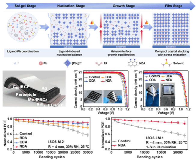 柔性钙钛矿太阳能电池凭借轻质、可弯折和高比功率等优势,可有效弥补晶硅电池在曲面赋形场景下的应用短板,在可穿戴电子、建筑一体化、便携式发电与航空航天等前沿领域具有广阔前景。然而,与成熟的刚性器件相比,柔性器件在效率与稳定性上仍存在明显差距,其核心挑战源于衬底由玻璃转向聚合物后带来的界面与结晶受限:柔性塑料衬底表面粗糙、导热性差,难以支撑钙钛矿薄膜的均匀成核与高质量结晶,同时与钙钛矿层之间的热膨胀系数不匹配会在制备过程中引入不可释放的残余应力。进一步,在实际弯折与光照条件下,薄膜易产生微裂纹和界面分层,加速电荷输运退化,限制了柔性的商业化使用。