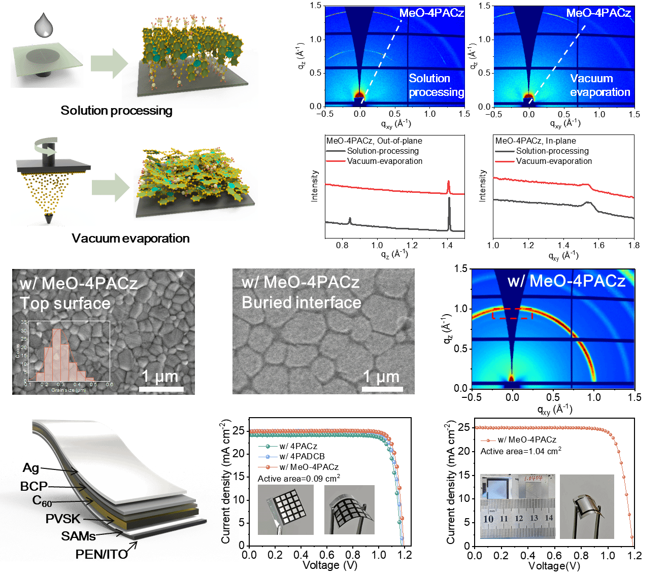 对于反式钙钛矿电池,传统溶液法制备的自组装分子(SAM)空穴传输层在柔性衬底上易出现覆盖不均与化学锚定不足的问题,导致界面缺陷增多以及电荷传输受阻,严重限制了柔性器件的效率与稳定性。针对这一关键挑战,公司钙钛矿材料与器件团队创新性地将真空蒸镀技术应用于SAM薄膜沉积,成功制备出高质量的SAM界面层,并系统研究了不同分子构型对柔性界面物性的影响规律。研究发现,干法制备的SAM薄膜具有更高的表面能和更强的化学锚定能力,能够在柔性沉沉地上形成致密、均匀且稳定的覆盖层,有效降低界面接触缺陷,同时确保上层钙钛矿薄膜的高质量沉积,有效提升界面电荷传输效率。基于此,团队制备的小面积柔性钙钛矿太阳能电池实现了25.47%的功率转换效率(认证效率25.38%),大面积器件(1.04 cm2)获得24.08%的高效率。此外,器件在机械弯折测试和长时光照条件下均展现出优异的稳定性,表现出良好的应用前景。该研究成功突破了柔性光伏界面工程长期存在的技术瓶颈,证明了真空蒸镀SAM技术对于发展高效钙钛矿器件的重要价值,并为柔性光伏的规模化制备提供了一条切实可行的路径。相关成果以“Beyond Solution Processing: Vacuum Evaporation of Carbazole-phosphonic Self-assembled Molecules Enables Flexible Perovskite Solar Cells with >25.4% Efficiency”发表于国际著名期刊《Angewandte Chemie International Edition》,公司2023级硕士研究生张征、2024级博士研究生陈鑫为共同第一作者,牛天启博士和赵奎教授为共同通讯作者(论文链接:https://doi.org/10.1002/anie.202511317)。