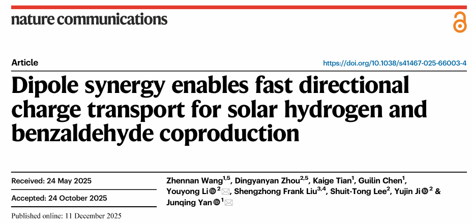 近日,公司William希尔官网入口闫俊青教授的科研团队联合苏州大学李有勇教授团队,在太阳能光催化制氢与苯甲醛协同制备方面取得重要进展。相关研究成果以“Dipole synergy enables fast directional charge transport for solar hydrogen and benzaldehyde coproduction”为题,于2025年12月11日在国际权威期刊《Nature Communications》上在线发表。论文第一作者为公司博士研究生王振南,通讯作者为公司闫俊青教授和苏州大学李有勇教授。