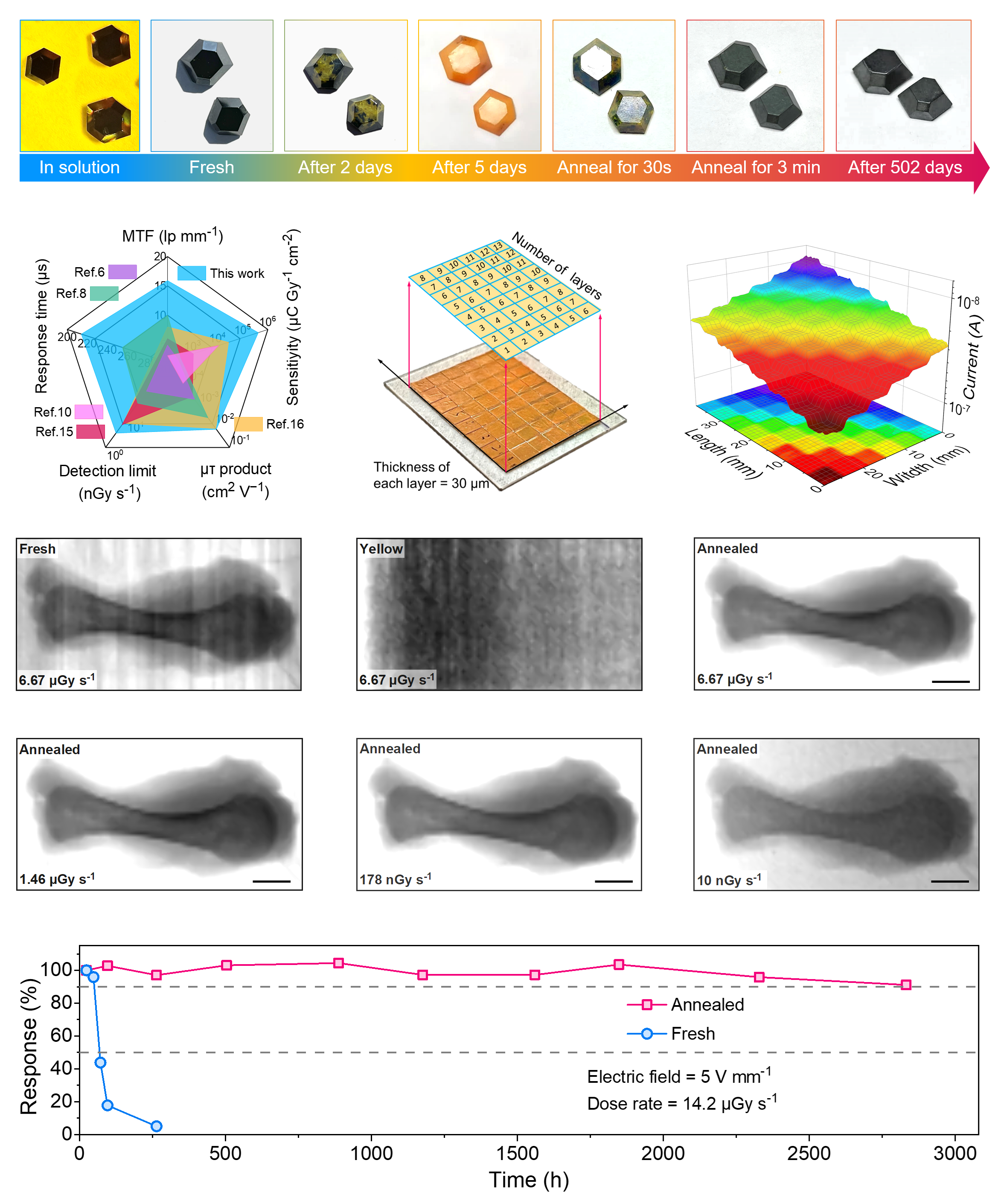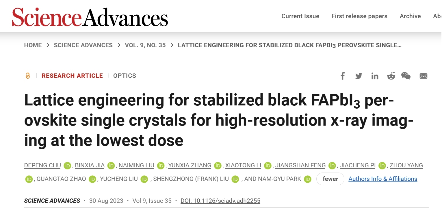 基于以上研究结果,团队于2023年8月30日在国际顶级期刊Science的子刊《Science Advance》刊发文章,报道了这一新型钙钛矿单晶生长设计方法及稳定性提升策略,证实了稳定的FAPbI3单晶材料能够在超低X射线剂量下实现高分辨率的X射线成像。这一研究结果有望推进未来低成本、高清、安全的射线成像技术开发。