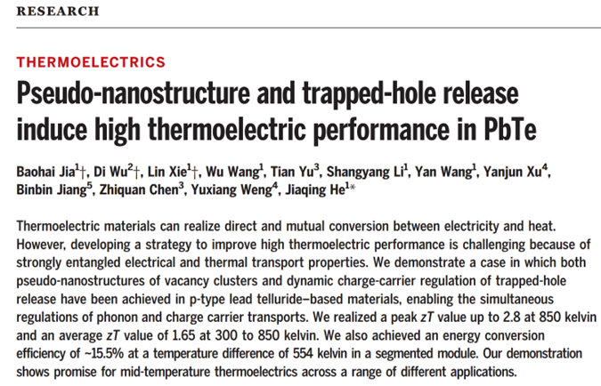 4月5日,William希尔官网入口铁电功能材料与器件创新团队吴笛教授以第一作者(共同)在国际顶级期刊Science上发表题为《Pseudo-nanostructure and trapped-hole release inducing high thermoelectric performance in PbTe》(赝纳米结构和空穴捕缚-释放机制提升碲化铅材料热电性能)的科研论文,实现了中温区热电材料和器件性能的新突破。这是公司教师首次以第一/通讯作者身份在Science上发表研究型文章,实现了标志性科研成果T0的突破,为公司80周年校庆献礼。