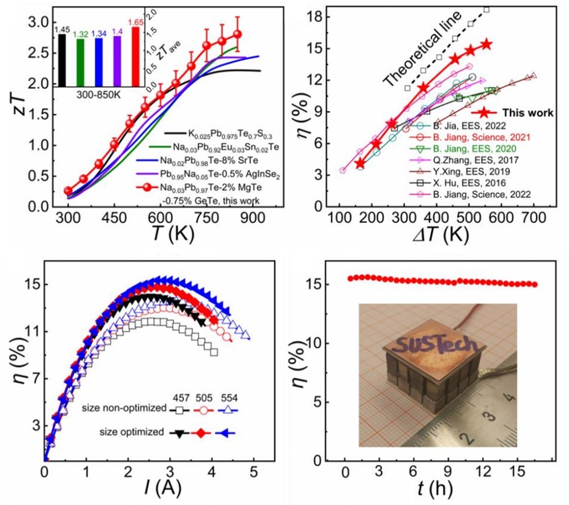 以上策略同时获取了优良的电输运性能和极低的热导率,有效地实现了电声输运的解耦合,从而获得了p-型热电材料中迄今为止最高的热电性能(ZT=2.8@850K)。以该材料为核心设计并制备的热电器件在554K温差下实现了高达15.5%的热-电转化效率,在佐证材料本征优异热电性能的同时,也为开拓中温区热电发电器件作为深海和外太空探测等应用场景的自维持免维护电源作出引领性的贡献。