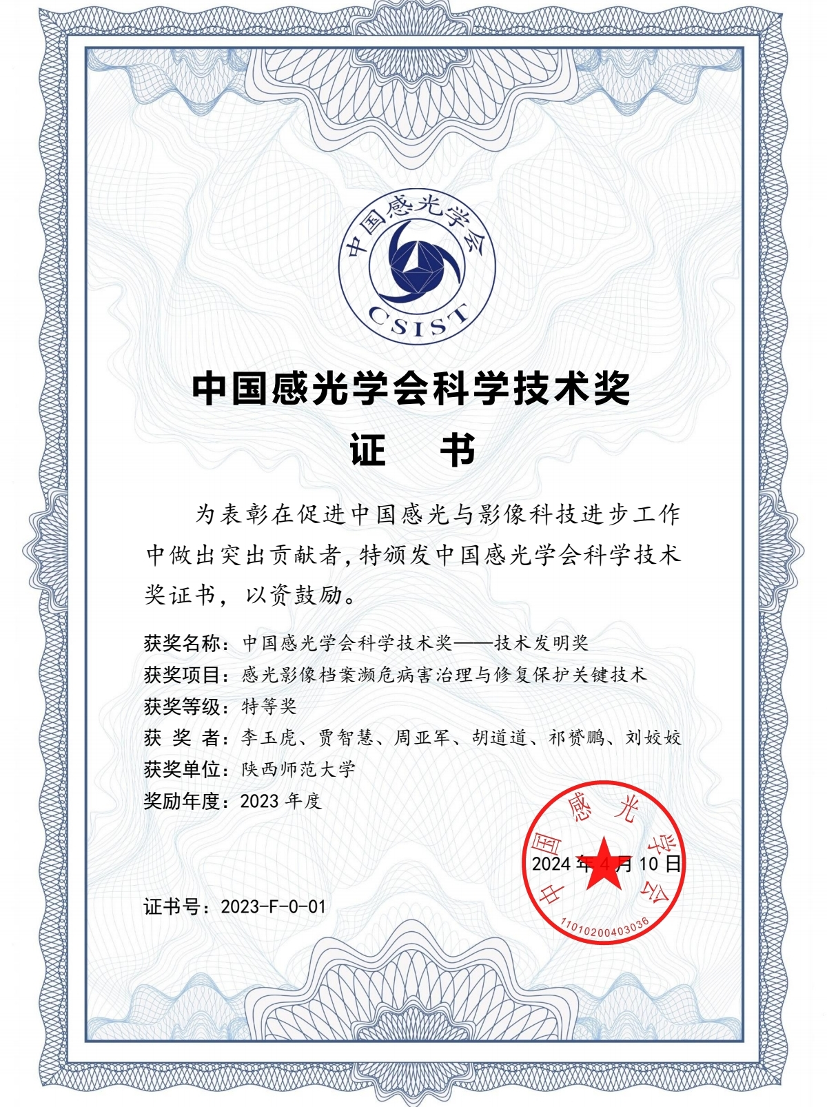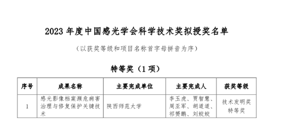 近日,中国感光学会开展了2023年度中国感光学会科学技术奖的推荐、提名、评审工作。经资格审查、专家评审等环节,决定授予李玉虎教授团队“感光影像档案濒危病害治理与修复保护关键技术”项目中国感光学会科学技术奖特等奖。