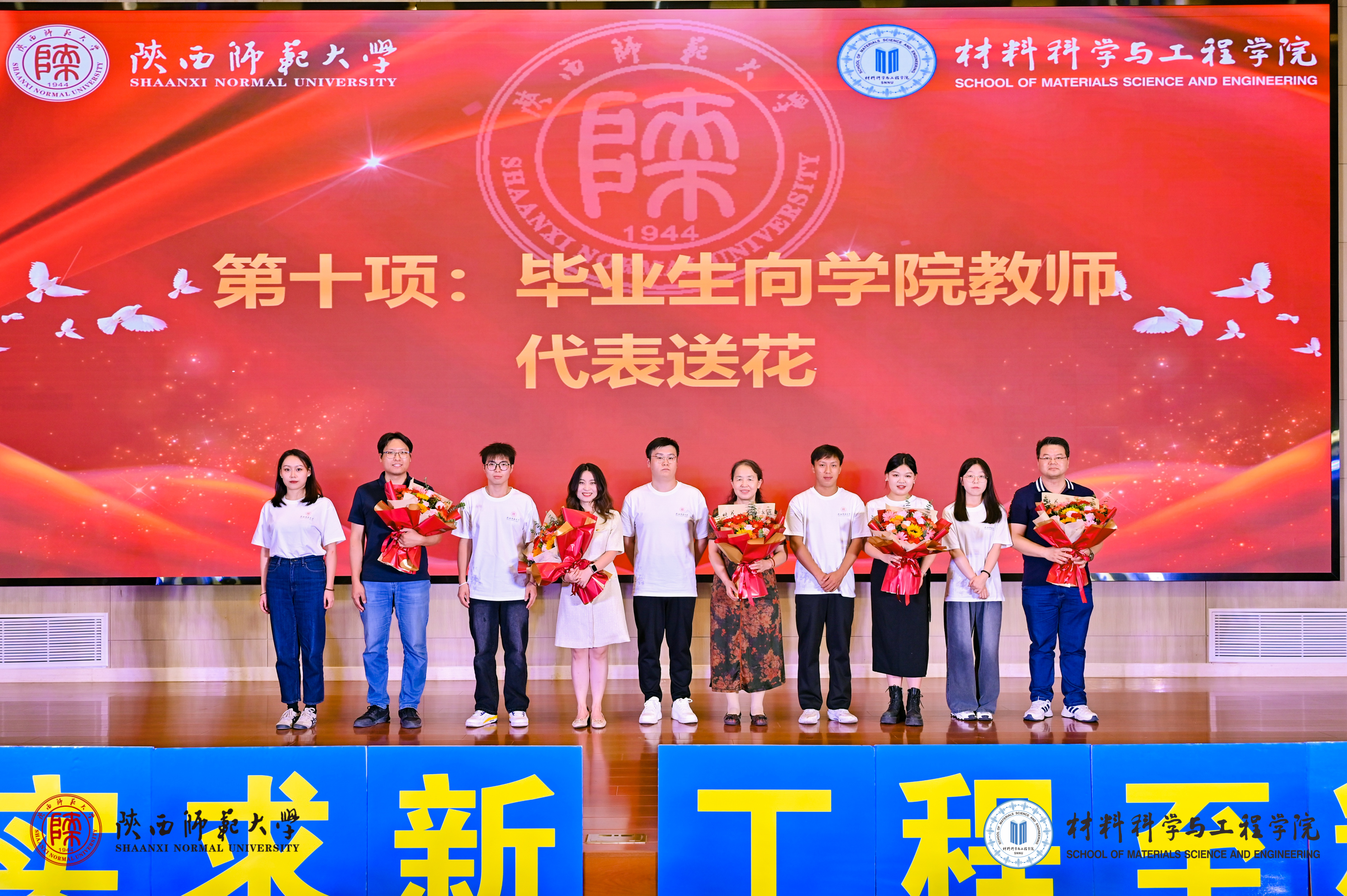 毕业生代表向教职员工代表献上鲜花,以感恩全体教职员工的辛勤付出和悉心教导。