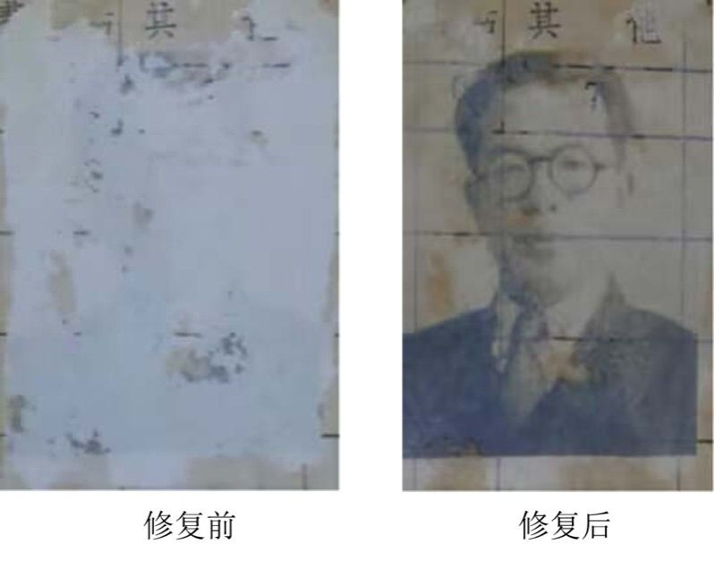 河南省档案馆珍藏的中华国有京汉铁路管理局吴石履历表中,贴有一张4.5cm×6.1cm黑白照片。由于年代久远,照片出现乳剂层粘连、脱落、缺失、模糊、霉斑、污渍等病害,严重影响人像信息的完整呈现与传承利用。为抢救这一重要史料,河南省档案馆将照片送至公司李玉虎教授领衔的感光与纸质档案保护国家档案局重点实验室进行修复。照片档案修复过程中,工作团队严格遵循“最小干预、修旧如旧”的档案保护原则,先通过高精度数字化扫描技术完成照片信息的完整采集,建立永久性数字副本;接着使用团队研制的显像加固剂,结合“劣化消失原貌显现加固技术”进行去污、祛斑、显影、加固等针对性修复,最大限度恢复原始影像光泽,吴石烈士眼神、表情、衣服、衣扣等细节得以还原,其青年时期的坚定刚毅形象得以重现。