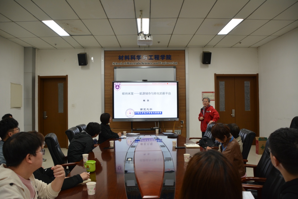 报告会后,胡征教授与在场的师生就报告中涉及到的介观结构碳纳米笼、碳纳米笼新材料的制备等问题进行了热烈的讨论和交流。