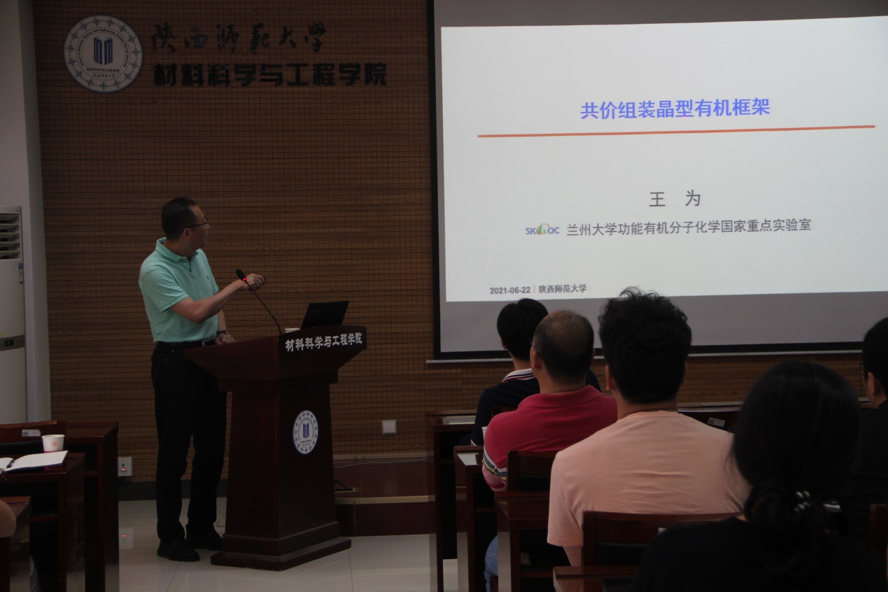 共价有机框架( Covalent Organic Frameworks,简称COFs)是近十年来发展起来的一种新型多孔材料。其结构特征包括有机组分、共价键连、以及晶型有序多孔结构等。精巧的结构设计和可控的共价键连组装能实现从二维到三维的各种共价有机框架的构筑。这共价组装过程不仅得到有序、延展、多样的晶型高分子物种,同时也构造出特有的结构和功能要素:孔。而如何获得大尺寸高质量的单晶是共价有机框架材料领域中的一个重大挑战。报告中,王为教授就COFs材料的基础研究以及近期他们课题组所取得的研究成果进行了分享。王为教授围绕共价有机框架材料中有序孔结构的构筑、表征和应用展开,重点汇报了如何采用共价组装实现晶型结构的精准构筑;如何实现结构和功能的“一箭双雕”组装;如何精细表征晶型有序的多孔结构;以及如何实现基于其结构特征的功能化应用进行了深入讲解。现场气氛活跃,王为教授的精彩报告赢得了在场师生的阵阵热烈的掌声。