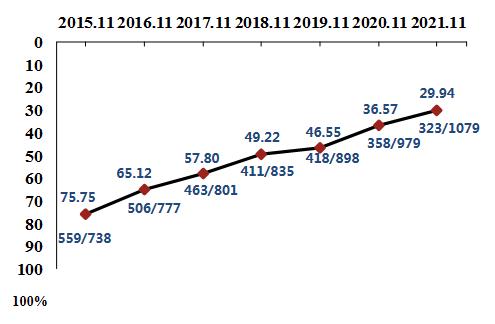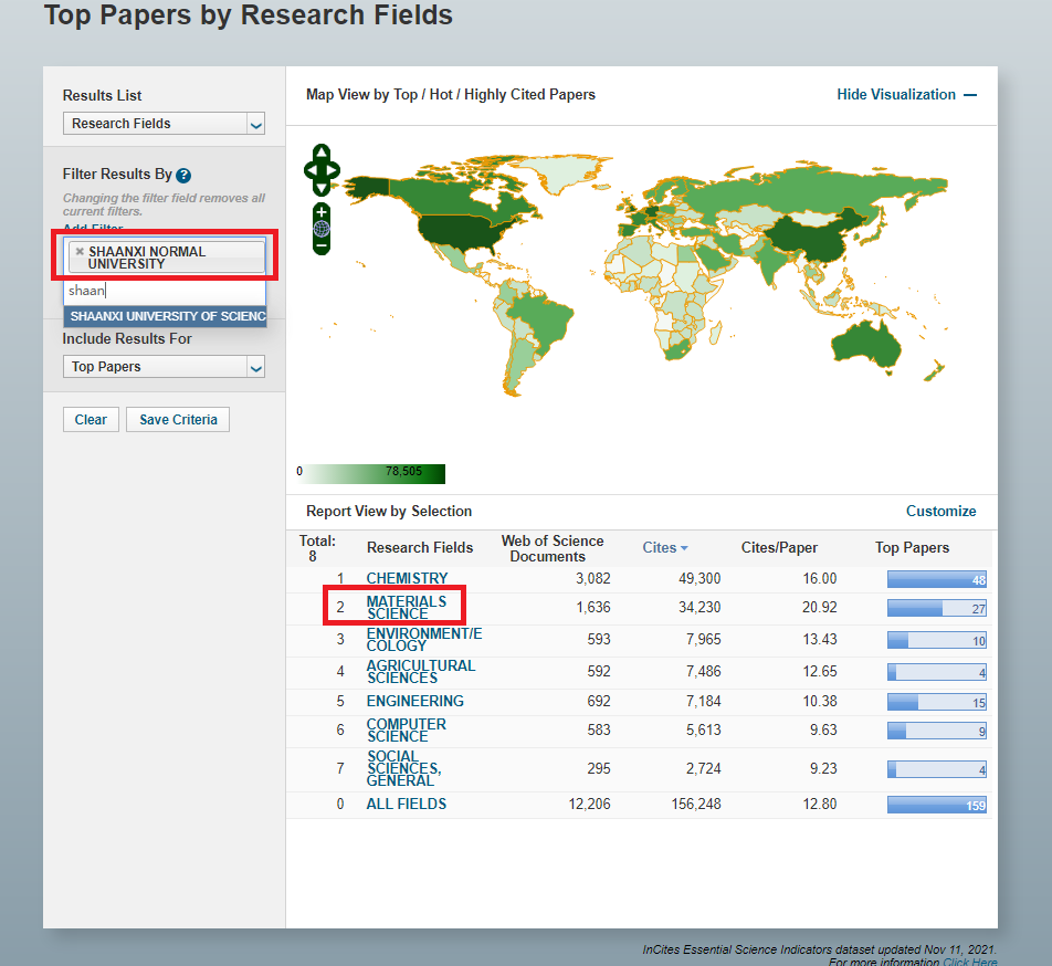 公司材料科学学科自2012年进入ESI全球排名前1%的学科以来,百分位次排名一直稳步提升,2018年、2019年、2020年同期ESI前1%学科中的百分位次排名分别为49.22%、46.55%、36.57%。近11年来,公司在材料科学学科领域入榜论文1636篇,总被引34230次,篇均被引20.92次,2021年ESI百分位次排名较去年同期增长22%。