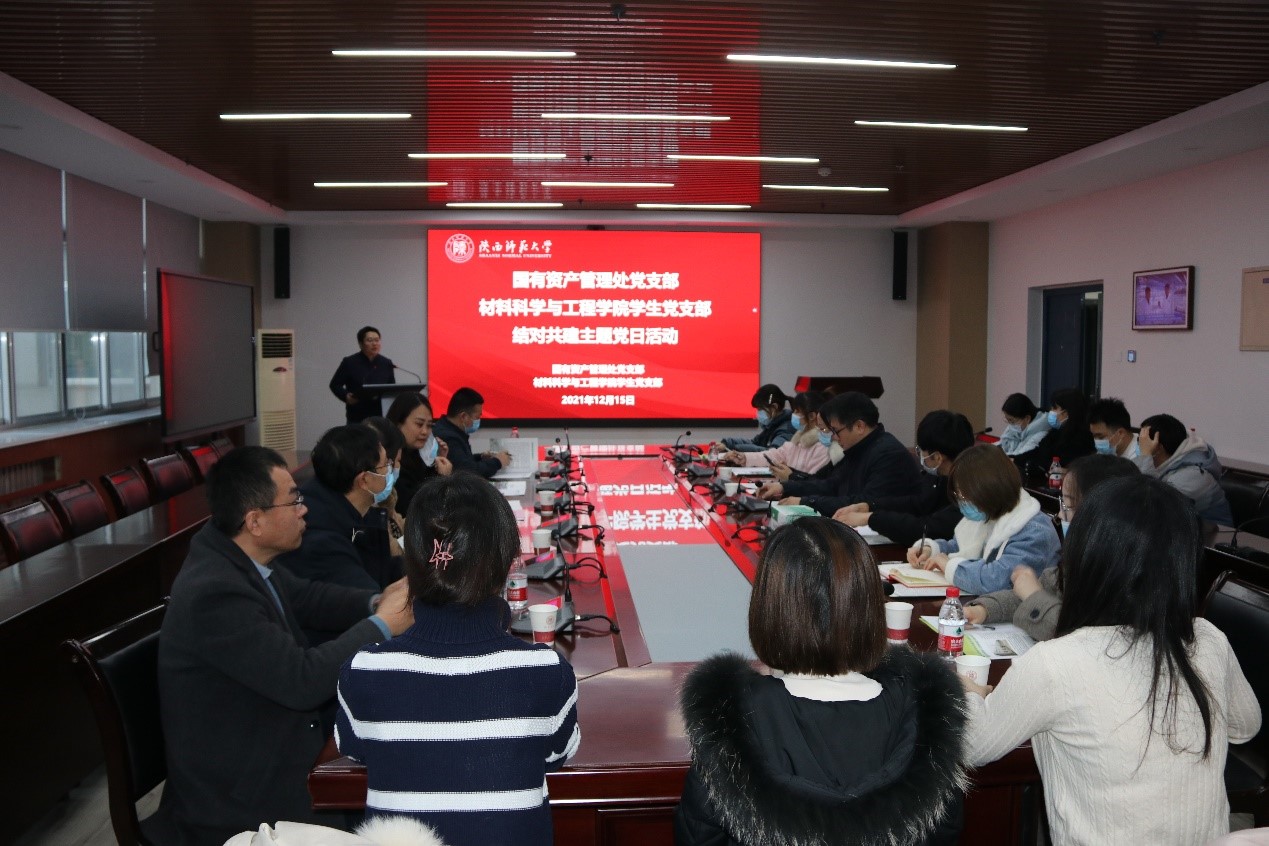 为深入贯彻落实党中央关于加强基层党组织建设的决策部署,按照“以共建促党建,以共建促了解,以共建促合作,以共建促发展”的原则,同时丰富广大师生的学习形式、拓展学习内容,12月15日,国有资产管理处党支部与材料科学与工程公司党支部开展了结对共建主题党日活动。
