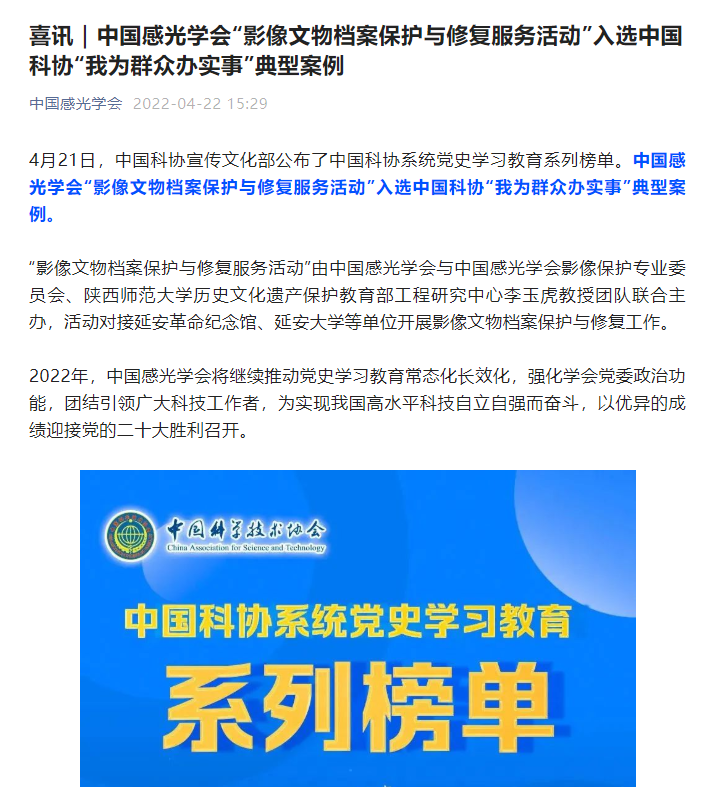 4月21日,中国科协宣传文化部公布了中国科协系统党史学习教育系列榜单。由中国感光学会联合公司William希尔官网入口历史文化遗产保护教育部工程研究中心李玉虎教授团队主办的“影像文物档案保护与修复服务活动”,入选中国科协“我为群众办实事”典型案例。