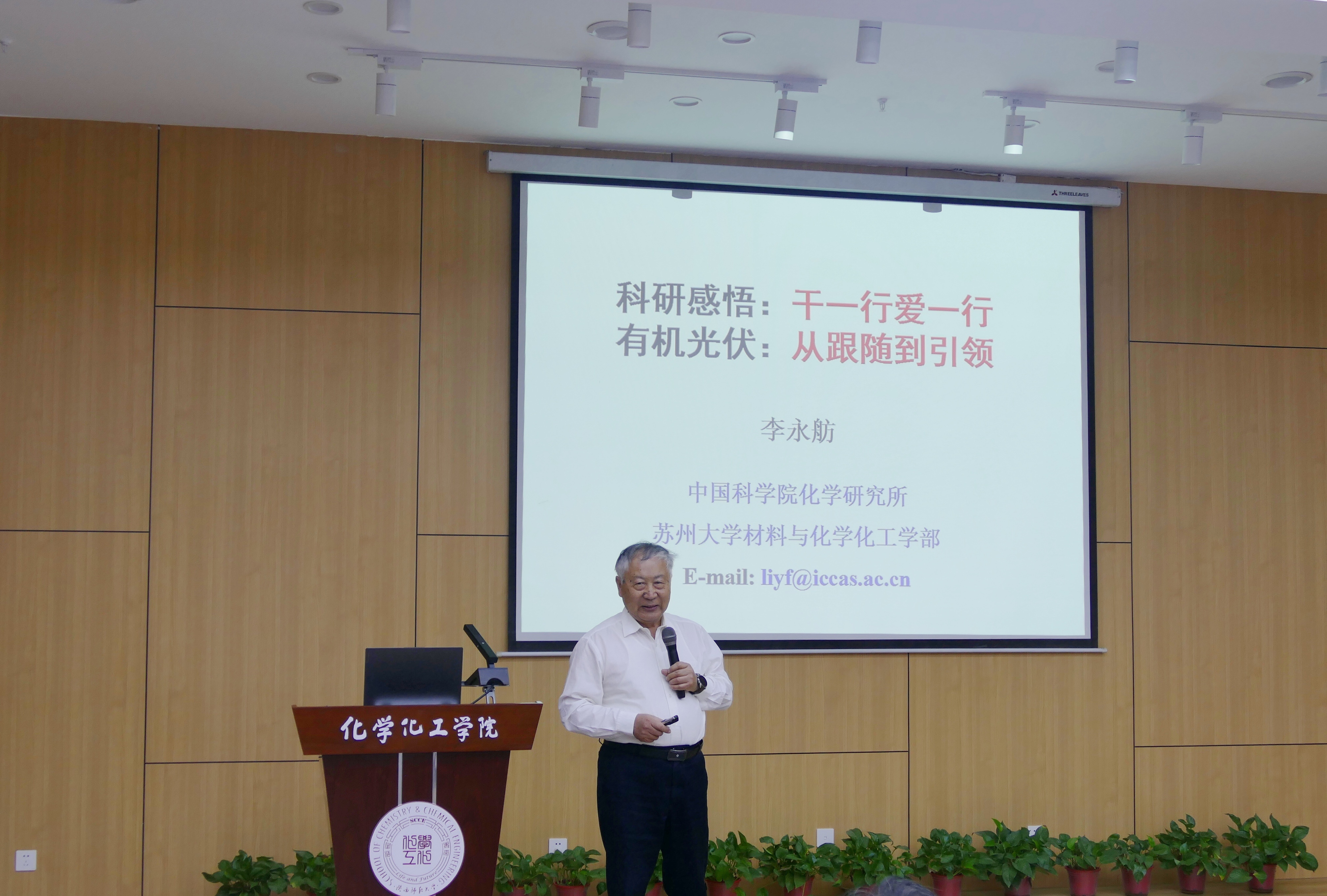 报告会上,李永舫院士分享了“热爱、用心、努力、认真”的生活感悟。热爱是最好的老师,应该干一行爱一行。作为研究生,遇到科研问题时要勤动脑筋、用心做事,在科研中了解所研究领域的最新进展,分析存在的关键科学问题,根据自己的知识背景以及所在实验室的研究条件,确定自己要解决的关键科学问题、探究解决问题的途径,天道酬勤和一丝不苟也是搞好科研必不可少的条件。李永舫院士从有机太阳能电池分子设计出发介绍了当前高效给体/受体材料的分子设计策略,小分子受体高分子化制备高效聚合物受体的策略和基于小分子受体的巨分子受体光伏材料,讲述了具有结构简单制备成本低的给体材料是未来有机太阳能电池商业化的关键。