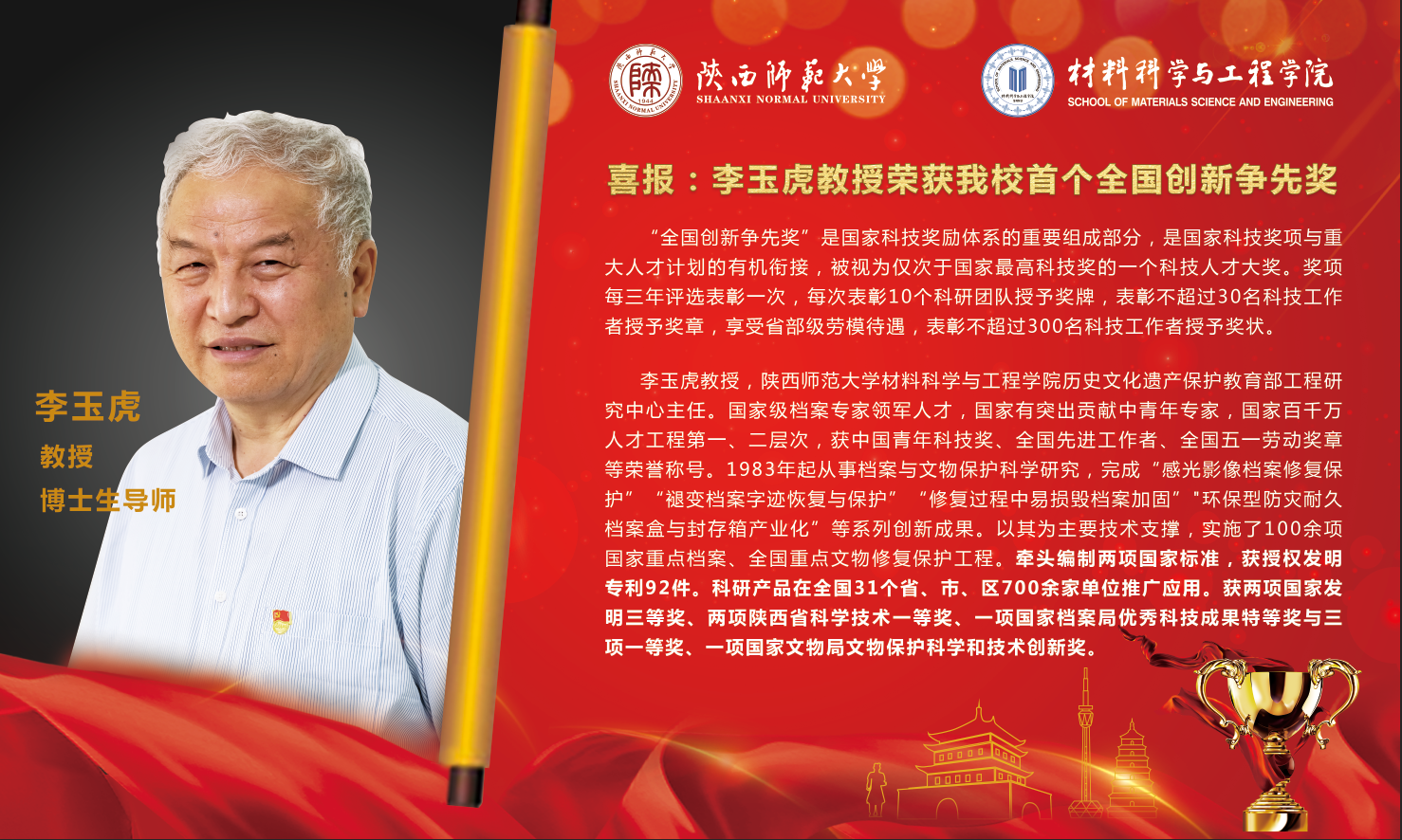 李玉虎教授团队根据我国文物资源特点的文物修复、预防性保护和防灾减灾体系,用科技创新驱动守护中华文脉,研究出“感光影像档案修复保护”“褪变档案字迹恢复与保护”“修复过程中易损毁档案加固”“环保型防灾耐久档案盒与封存箱产业化”等一批关键材料、工艺、装备和集成技术。通过李玉虎教授团队的努力,档案中消失的字迹清晰重现,粘结劣变的电影胶片修复后现“真容”,风化褪色的古代壁画恢复原貌,红色革命文物得以“重现”。