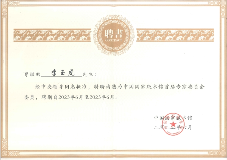 2023年6月30日,中国国家版本馆在北京中央总馆(文瀚阁)举行专家委员会成立仪式。会上,中国国家版本馆馆长刘成勇宣读聘任决定,聘请李致忠、范迪安等37位专家组成中国国家版本馆首届专家委员会,公司历史文化遗产保护教育部工程研究中心主任李玉虎教授受聘为首届专家委员会委员。