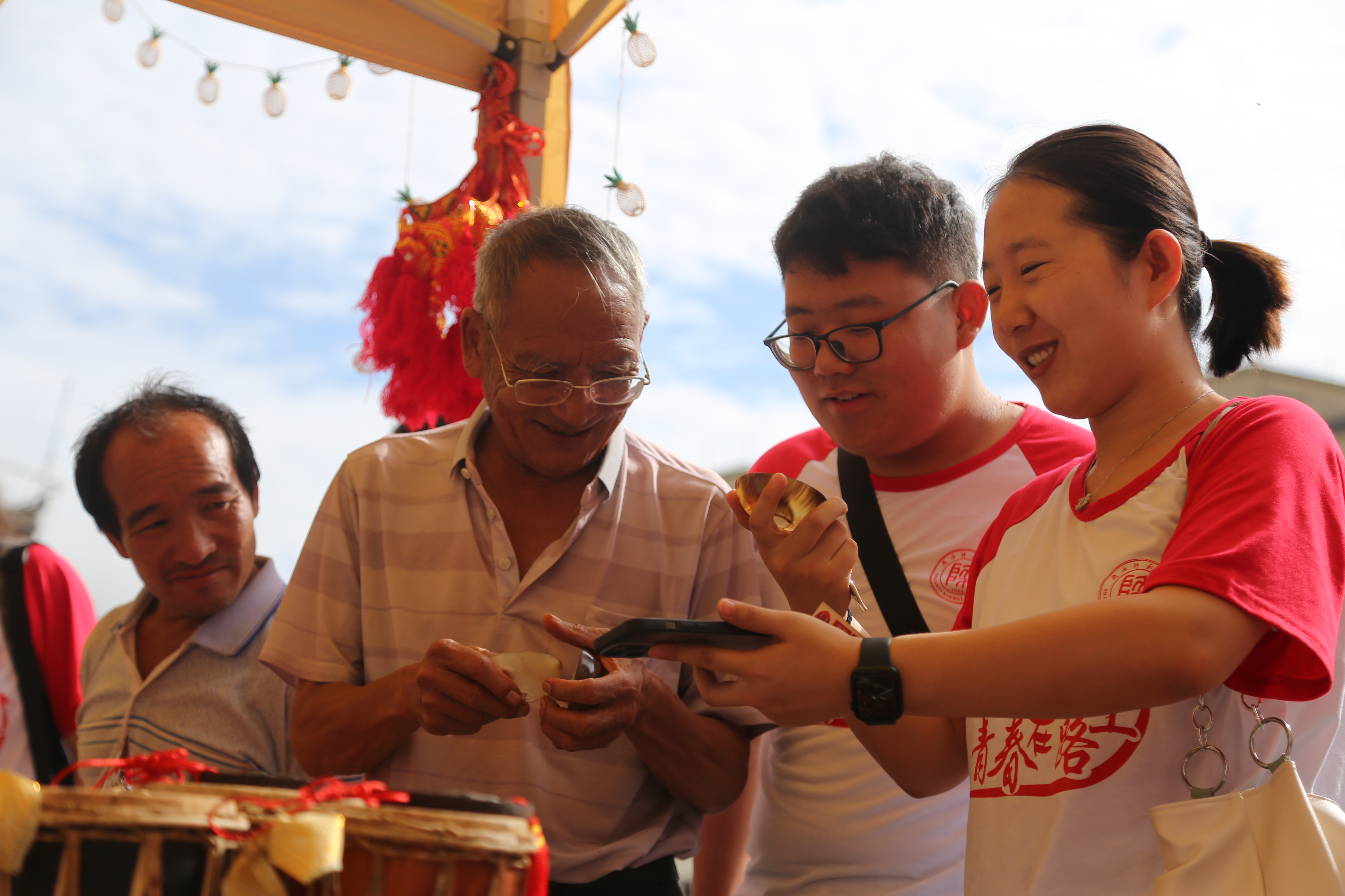 实践团成员赴芒现村传承了三代的市级非遗传承项目“象脚鼓”制作世家了解象脚鼓的文化。
