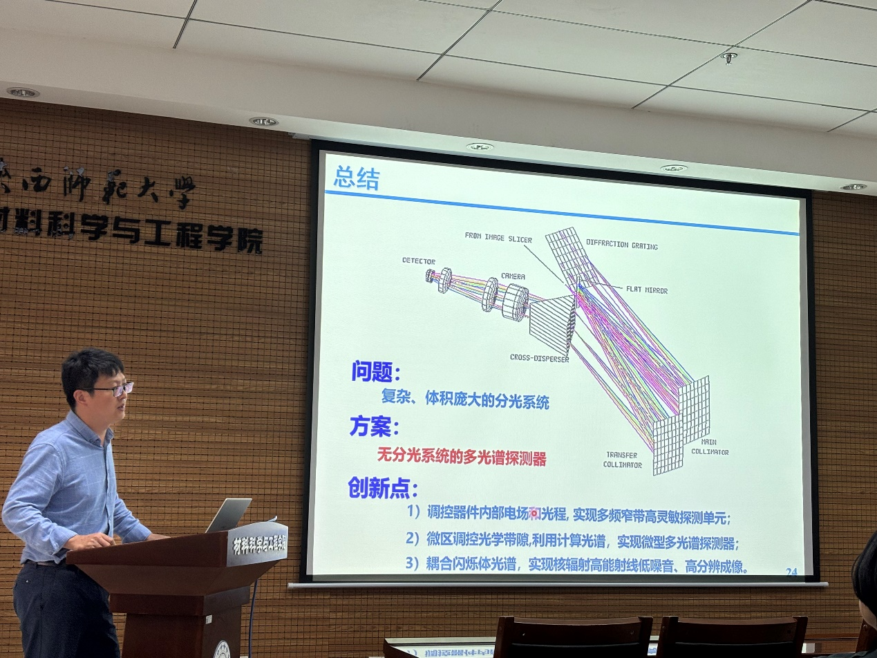 徐晓宝教授以“微型多光谱探测器研究”为题,以光谱识别精细化、易集成、可穿戴的等应用技术要求为背景,介绍了多光谱探测器作为光谱识别的重要设备。多光谱探测器的开发主要从光学工程角度入手,如光学元件、分光系统微缩,解决面临着传统光学架构局限(d∙sinθ = n∙λ/2d=nλ)导致的体积与性能不可兼得的难题。徐晓宝教授选择钙钛矿光敏材料为切入点,结合光学、电子以及计算成像等理论和技术,提出并开发基于光程调控的无光学元件辅助微型多光谱探测器,在光谱识别探测单元、微型多光谱探测阵列及其多功能融合方面,开展了深入、系统的研究工作,包括:1)发展了基于光生载流子动力学、光学微腔的光程调控方法,实现了光谱分辨达到~12 nm的窄波段响应探测单元;2)提出了无分光元件多光谱探测器的设计新思路,构筑了微米线微型多光谱探测阵列;3)构建了多光谱探测器-闪烁体集成器件,实现核辐射高分辨感知和成像功能。