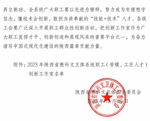 近日,陕西省教科文卫体工会委员会下达了《关于命名2023年陕西省教科文卫体系统 职工(劳模、工匠人才)创新工作室的决定》,决定命名20个创新工作室为陕西省教科文卫体系统职工(劳模和工匠)创新工作室”,公司李玉虎教授团队申报的“李玉虎档案与文物修复保护工作室”成功入选。